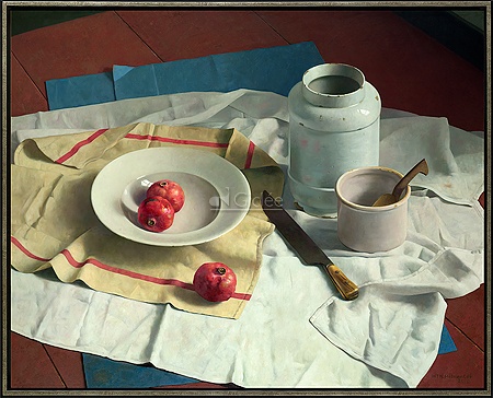 Stilleven met Delftswit en granaatappels op doeken
